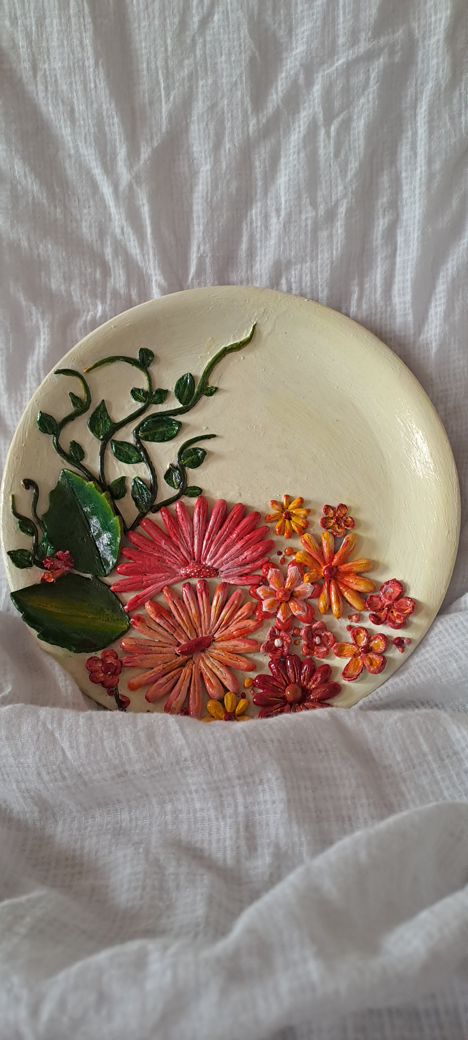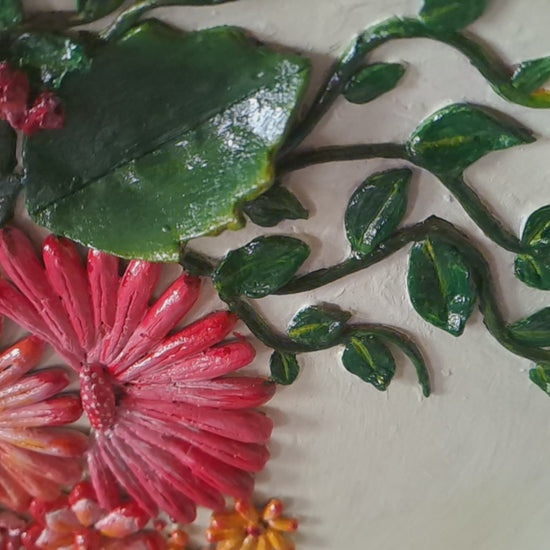 This vibrant artwork is sculpted directly onto an eco-friendly earthen clay plate, featuring handmade clay flowers and leaves that rise beautifully in 3D relief. The background is painted in a soft, soothing light yellow, creating a warm contrast that makes the colors pop.