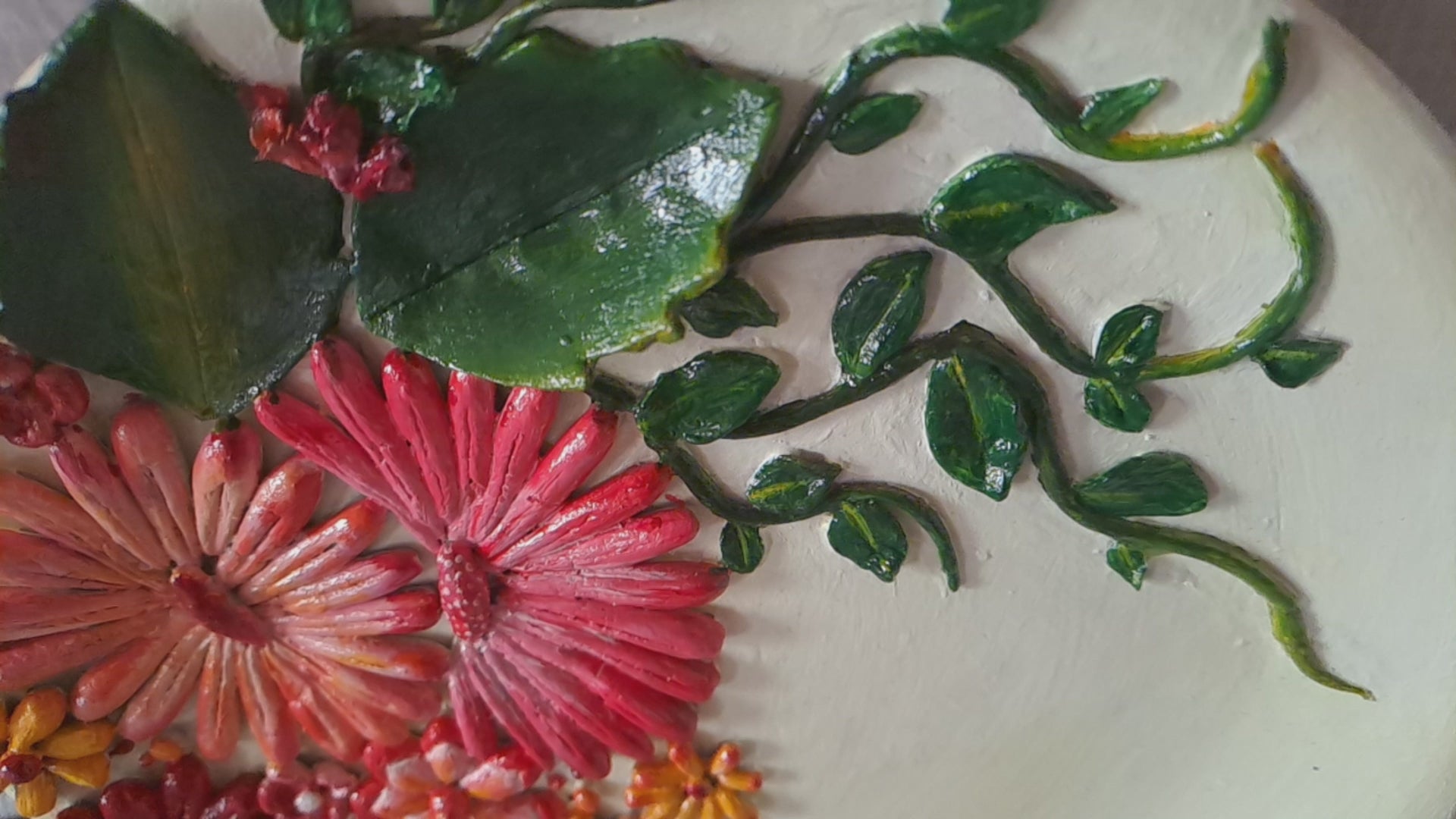 Each flower bursts with rich shades of red, orange, pink, and yellow, while the lush green leaves are detailed with visible veins, giving them a lifelike appearance. The entire composition flows organically across the plate, blending sculptural craftsmanship with artistic flair.