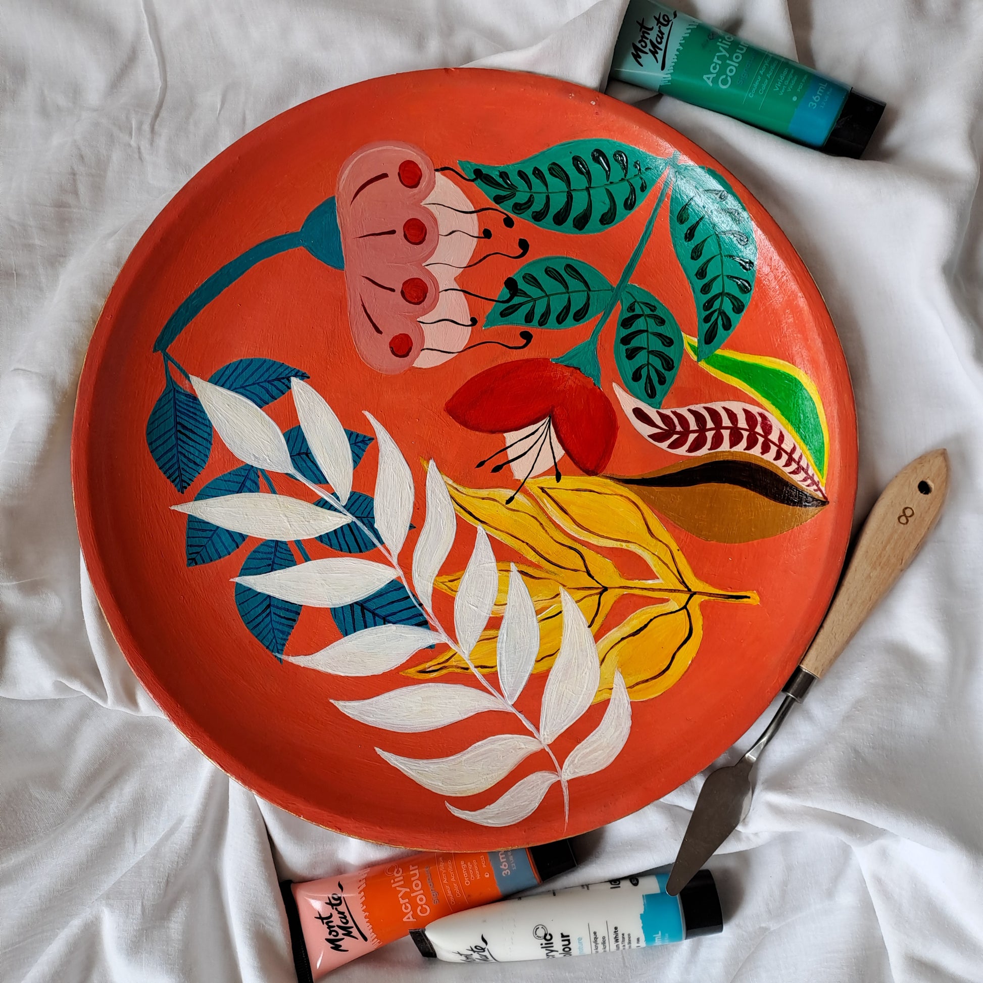 Add a splash of color and conscience to your home with "Floral Whimsy," a beautifully hand-painted abstract floral artwork on a traditional earthen clay plate. This one-of-a-kind piece blends bold botanical forms with modern design sensibilities, making it the perfect accent for any contemporary or bohemian space.